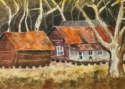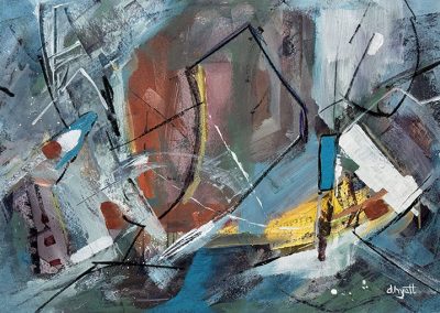 Drawing on both my agrarian upbringing and professional experience as a craftsman builder, I am curious about imagery reflecting our collective search for, and creation of, place in the world. A solitary mapmaker surveying the wilderness speaks to our natural instinct to expand as well as our boundless optimism and appetite for it. An abandoned bulldozer, modified for the specific purpose of tree pushing, speaks to our nature to build and to improve the human condition. An old, neglected farm building, persisting only until weather and gravity have done their work, reflects the impermanence of our efforts. Together, this cycle of place-making and deterioration capture our quest for a better life while acknowledging its limitations. For me, painting place is a process of self-discovery as I interpret imagery that attracts me, using tools of water, paper, color, and brush to tell a story. This might take the form of an impressionistic work or even abstract expressionism. My impressionistic approach is earnest yet intuitive, flexible, and full of surprises, using the interaction of light, shadow, and reflection to explore place and the artifacts of human endeavor. My abstract work is more light-hearted, and I use additional mediums and tools to balance elements of depth, shape, color, and movement. Inspiration for my abstract work could come from just anywhere: a visual cue or even an idea.