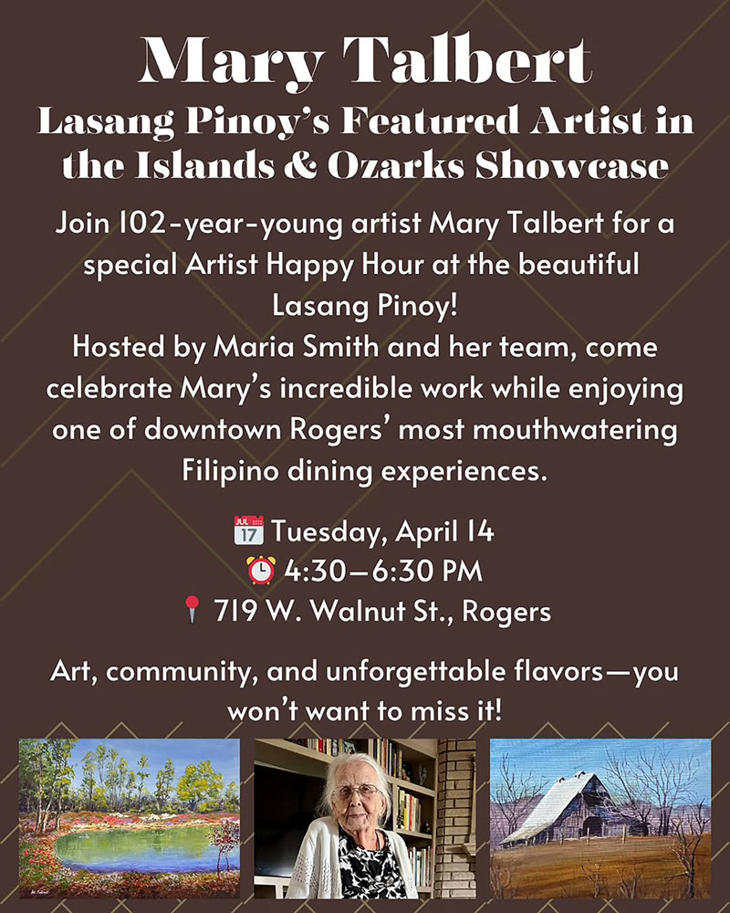 Mary Talbert at Lasang Pinoy’s Exhibits, News Mary Talbert – Artist Lasang Pinoy Artist Reception: April 8, 2026 4:30 pm – 6:30 pm 719 W. Walnut Street • Rogers, AR